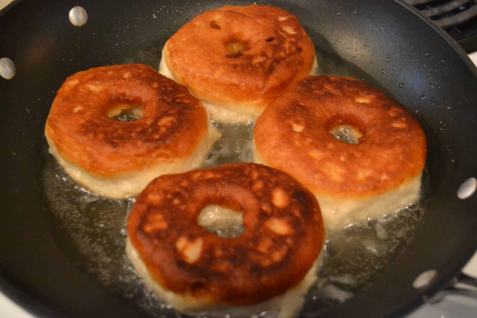 - After your oil is hot and ready to go carefully place the donuts in and let them get golden brown.